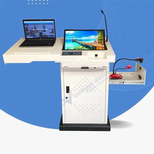 Full metal body digital podium machine with 22" touch monitor, integrated PC, and audio system. Offers versatile ports (XLR, USB, HDMI) for diverse presentations.