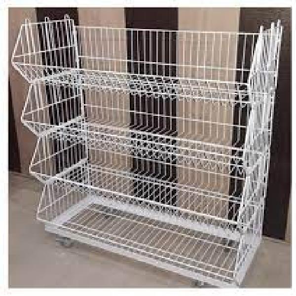 Movable metal display rack with 5 shelves for supermarket use. Features 50 Kg weight tolerance capacity. Ideal for organized product presentation.