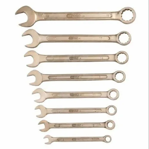 Aluminium Bronze non-sparking spanner set including double open end, ring, and combination types. Features golden yellow color and a 1-year warranty. Minimum order quantity is 10 units.