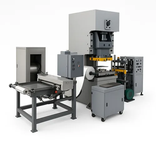 Machine designed for the fabrication of aluminium foil containers. Built for efficient production of various aluminium container types.
