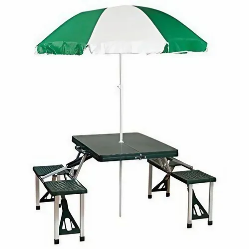 Rectangular aluminium picnic table with integrated umbrella. Foldable and portable design, ideal for garden use. Polished surface finish. Minimum order quantity of 2 units.