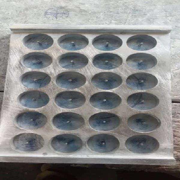Aluminium tea light candle mould with a round shaping mold. Dimensions are 35mm diameter and 10mm height. Ideal for creating small wax candles.