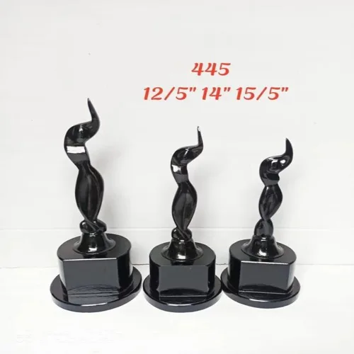 Aluminium trophy set in three sizes (10-15 inch). Features a plain pattern and black color with a round dial. Suitable for school applications and sold new.