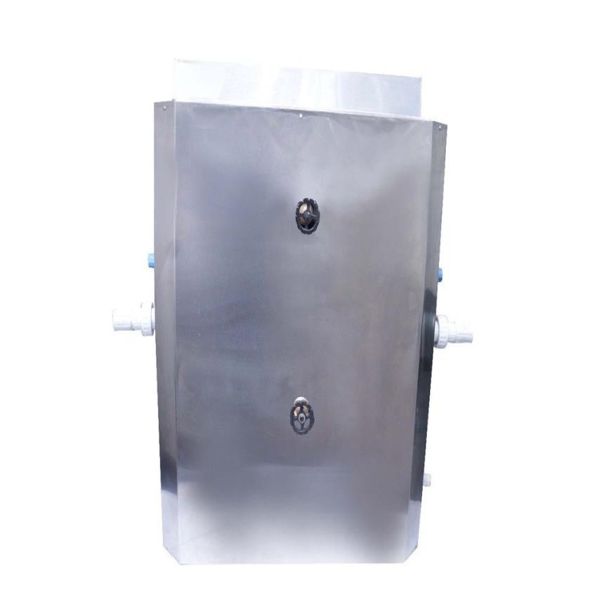 Stainless steel overhead tank filter. 2-stage filtration system with 60 LPM flow rate. Cleans and filters water. Dimensions: L-67cm*W-27cm*H-62cm.