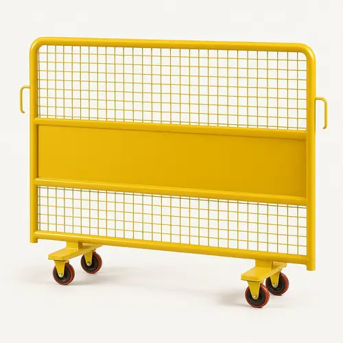 Portable metal barrier equipment, 5 x 8 size, with 2-5 mm thickness. Yellow painted finish, ideal for road safety applications. Weighs 100 kg.