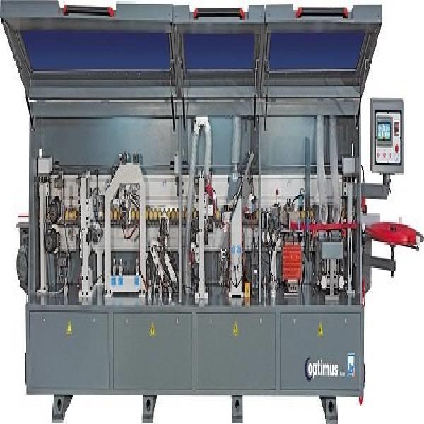 Automatic 3 phase machine, 440V, 12 KW power. Fixes PVC bands on board edges. Features a feeding speed of 15 to 25 meters per minute.