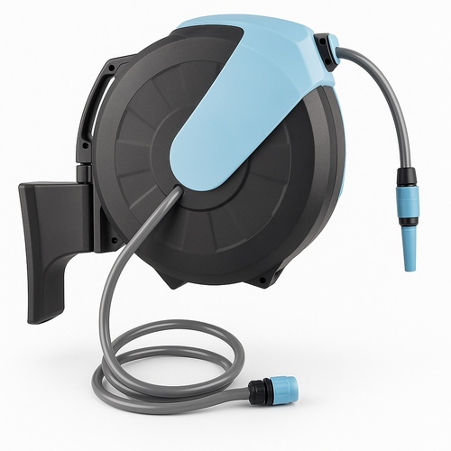 Auto-retractable hose reel with 30m length and a lock mechanism. Supports 150 PSI pressure. Includes spray nozzle, connectors, and mounting bracket.