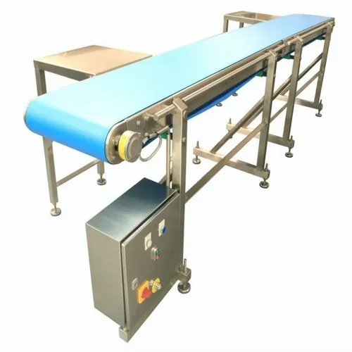 Modern assembly line belt conveyor with rubber or PVC belt, >12 inches width. Custom length, mild steel/stainless steel structure. Various capacities available.
