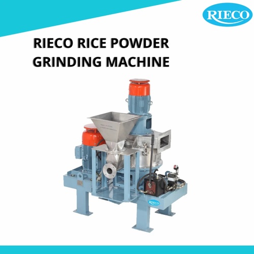Three-phase automatic rice powder grinding machine with SS 304 contact material. Features a painted finish and RIECO design. Capacity ranges from 100 to 2000 KG/HR with motor power from 10 to 200 HP.
