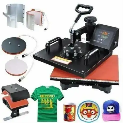 Automatic 5-in-1 heat press machine for sublimation on T-shirts and garments. Features programming card controller, A4 dimensions, and a 20-30 second printing speed.