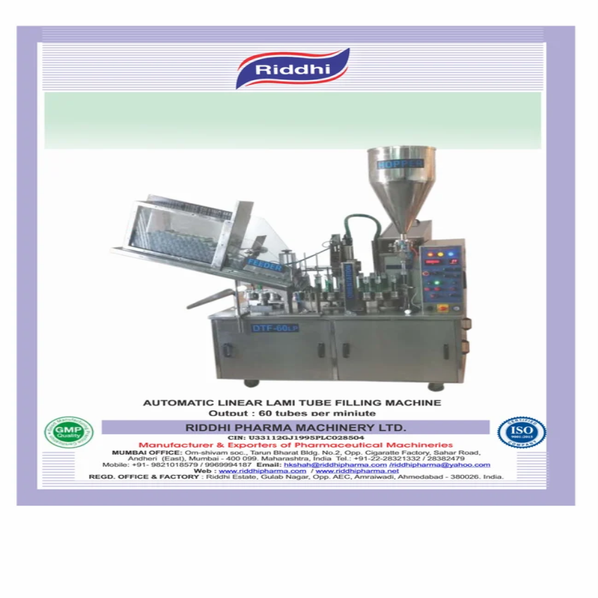 Automatic mechanical equipment for filling aluminum tubes with cream. Made in India, it handles 5-250g fills at 40 TPM. Operates on 410V, 3KW electric power.