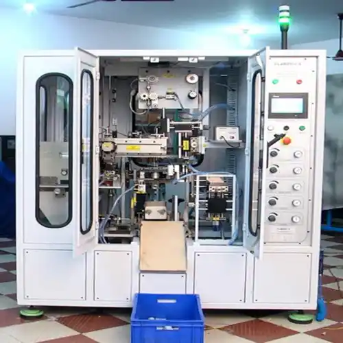 Automatic capacitor wire soldering machine. Designed for high-volume production of soldered wire connections on capacitors.