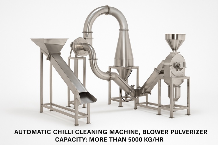 Industrial automatic blower pulverizer. SS 304 contact parts. 5 HP motor, 5 Kwh consumption. Over 5000 kg/hr capacity with three-phase connection.