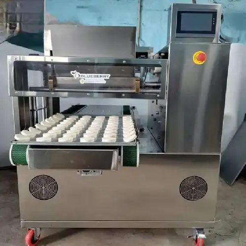 ISO certified automatic cookie dropping machine with 100 Kg/h capacity. Features 3 HP motor, single/three phase, and 5-7 nozzles. Ideal for bakeries.