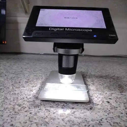 Automatic digital LCD microscope, model DM4. Portable and suitable for scientific and laboratory applications. Constructed from plastic and aluminium.