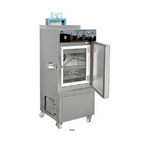 Automatic heating photostability chamber made of mild steel. Operates on 220V, 50-60Hz single phase power. Temperature range 20-50°C with ± 0.2°C accuracy.