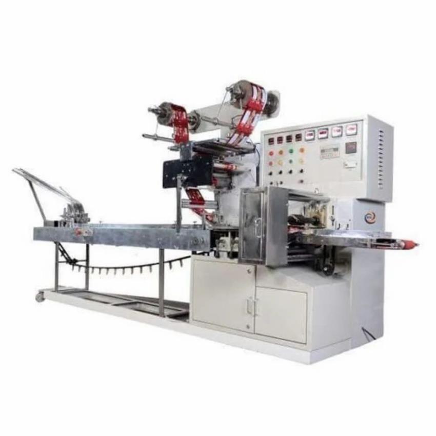 Automatic horizontal form fill seal machine. Industrial application, Made in India. Operates on 220-440V. High capacity of 1000 pouches per hour.