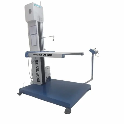 Automatic laboratory drop tester in blue and white. Features a digital display for precise measurements. Designed for testing packaged items.