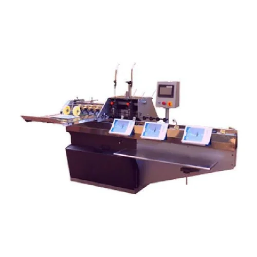 Semi-automatic notebook stitching machine with counting and collecting features. 0.55KW power, speeds of 500-5000 sets per hour.