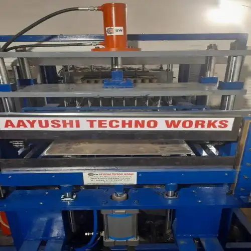 Automatic nursery tray making machine. 3-phase, 12 KW power. Forms 8-10 strokes per minute with 24 heaters. Power coated finish, 2200 KG weight. Made in India, 1-year warranty.