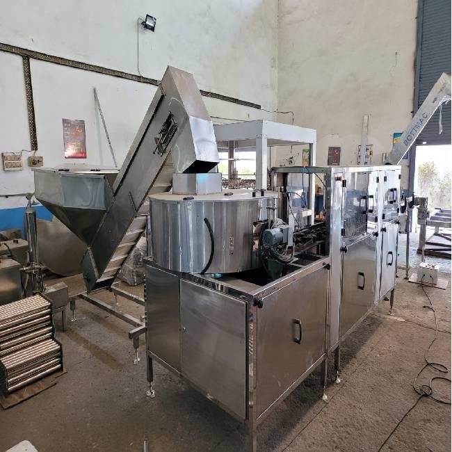 Automatic PET bottle unscrambler device designed for efficient bottle handling. This equipment ensures accurate orientation of plastic bottles for further processing.