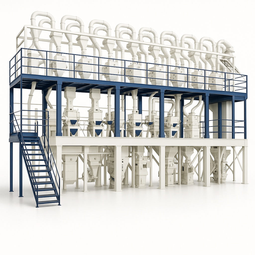 Fully automatic rice mill plant, 4 ton capacity, 100-150 HP motor power. Utilizes 440V voltage and 75-112 kWh power consumption.
