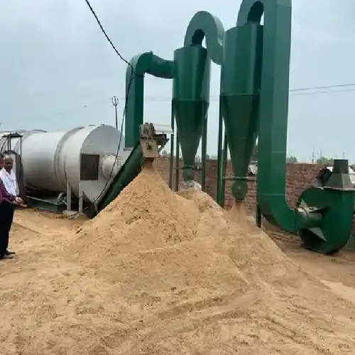 Automatic Rotary Drum Dryer Machine. Mild steel construction, 700°C max temperature, 2-meter diameter, 12-ton weight. Coal heated.