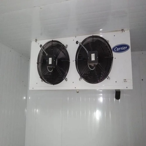 Automatic single cold room evaporator machine, 50 Hz frequency, 10 Ton capacity. Constructed from mild steel with two fans.