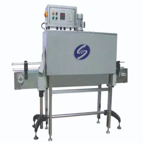 Single phase, 220V automatic shrink labelling machine. Constructed from SS & powder-coated material. Designed for continuous operation with thermostat control cabinet.