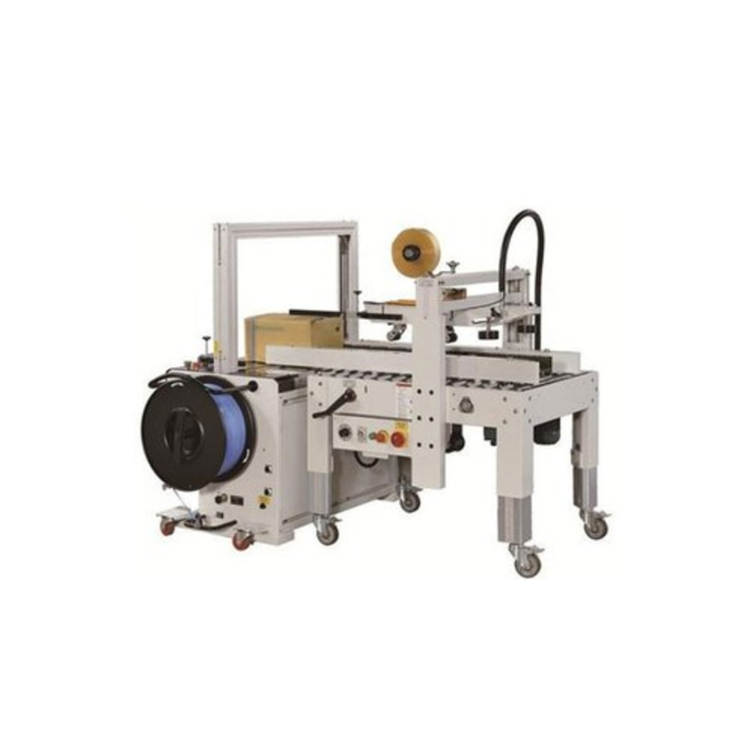 Single phase automatic taping and strapping machine for industrial use. Features adjustable table height, 50mm or 76mm tape width, and 20 cartons per minute sealing capacity.