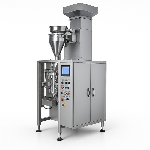 Industrial automatic volumetric cup filler machine made of stainless steel for efficient material handling and precise filling operations. Suitable for various industrial applications.