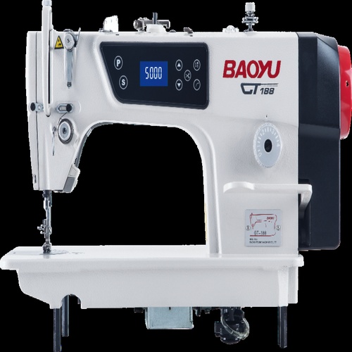 Baoyu GT-188 single needle sewing machine for light materials. Features automatic grade, 550W power, and 3000-4000 stitches/minute. Maximum stitch length is 5 mm.