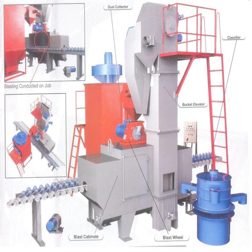 Industrial shot blasting machine designed for bars. Features robust construction for efficient surface preparation and contaminant removal.
