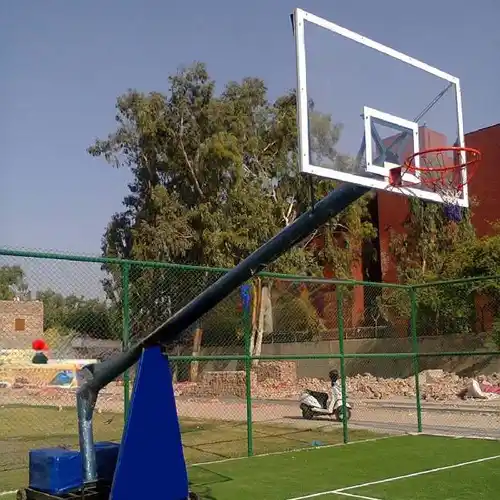 Durable basketball stand, 10 ft standard height, 3mm thick MS 6-inch round material. Suitable for schools, playgrounds, and sports stadiums.