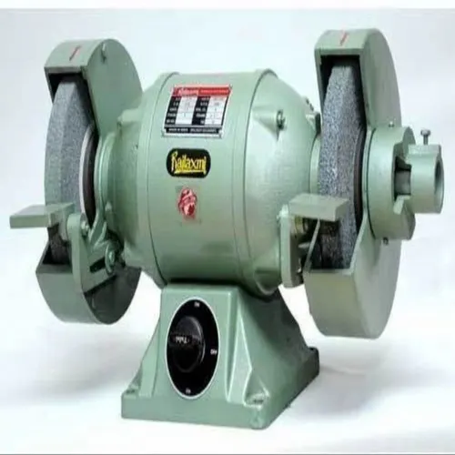 Bench grinder machine with 0.75 HP power, 8-inch disc diameter, and 2800 rpm no-load speed. Features a lock-on/off switch and operates on 230V, three-phase power.