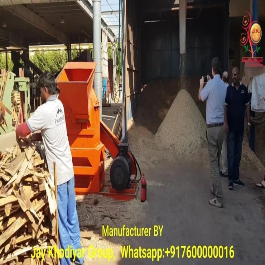 Automatic biomass grinder machine for agriculture and farming. Electric-powered, orange color. Efficiently processes biomass materials for farming applications.