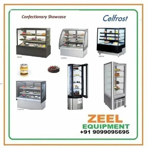 Closed black glass refrigerator display case for sweet and bakery shops. Maintains +2°C to +8°C with 3 shelves. Rectangular shape, 48-inch height.