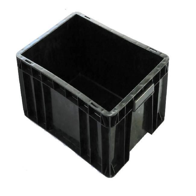 This black industrial plastic crate features a solid rectangular design with dimensions of 400 x 300 x 220 mm. It includes handles and has a volume of 0.0264 m3, weighing 1.4 Kg.