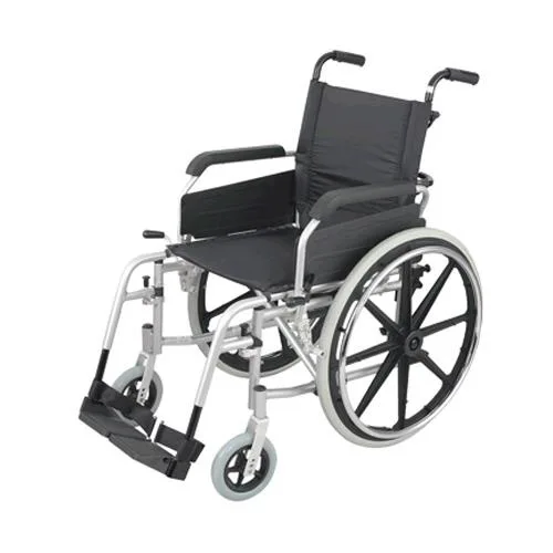 Manual wheelchair with a black frame made of SS. Designed for hospital applications, it supports up to 250 lbs weight capacity. Minimum order of 5 units.