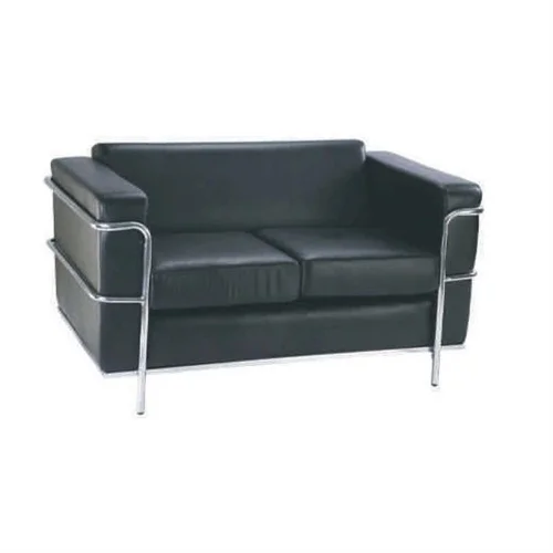 Leather two-seater office sofa in black and silver. Modern appearance with stainless steel legs. Made in India. Model SL-298.