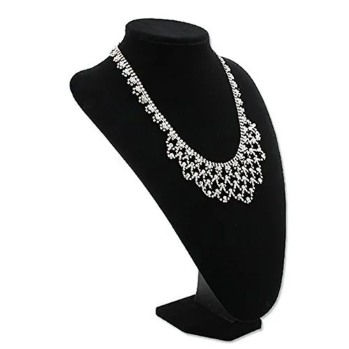 Solid wood necklace display stands, 8x10x12 inches. Pre-assembled for immediate use. Open storage design in black and white colors. Minimum order quantity of 10.