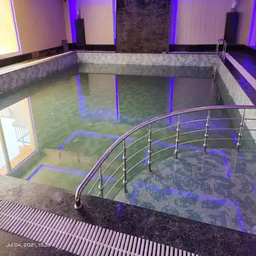 Blue concrete indoor swimming pool for hotels/resorts. 40x45ft dimensions, 4ft height, 50 person capacity. Features a 3 HP filter pump. Overflow design.