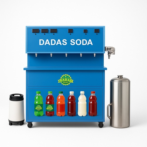 Blue automatic/semi-automatic mini soda bottling machine. Designed for CSD products, offering bottle packaging with a 1-year warranty.