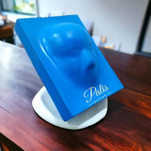 Blue polyresin mask book for home decor. Dimensions: 8" L x 5" W x 8.5" H. Minimum order quantity of 1 piece. Ideal for decorative use.