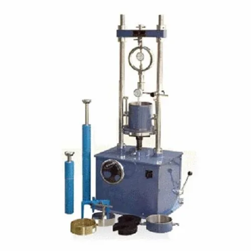 Automatic CBR machine in blue, made of mild steel for industrial applications. Features a Baker dial gauge. Manufactured in India for new sales.