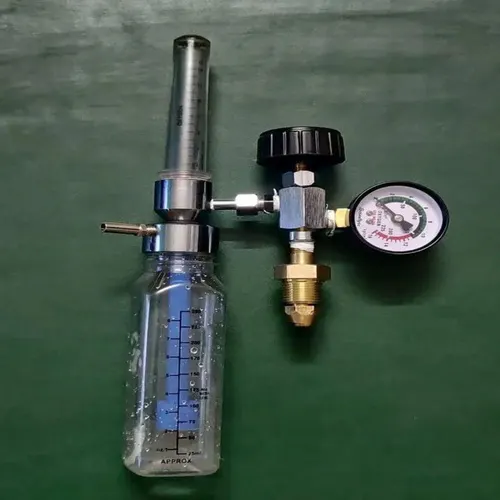 Brass valve with humidifier bottle. Features analog display and polycarbonate tube cover. Flow rate from 0-15 L/min with +/- 3% accuracy. Designed for oxygen cylinder usage.