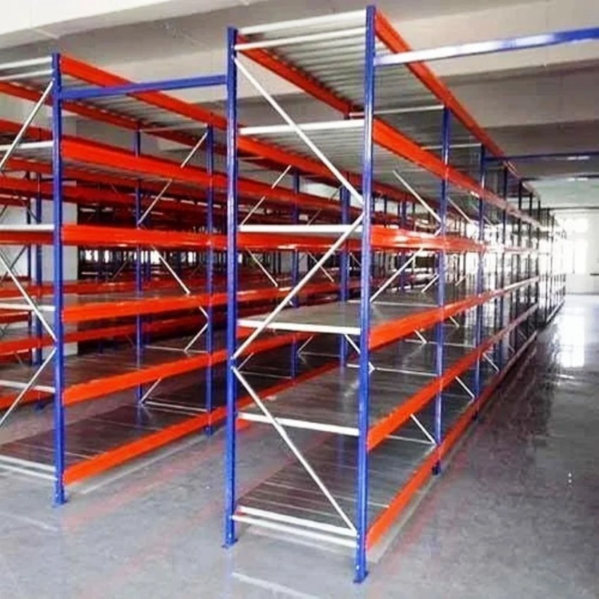 In-stock, color-coated mild steel light duty rack. 10 feet height, 6 shelves, and 150 kg load capacity per layer. Made in India.