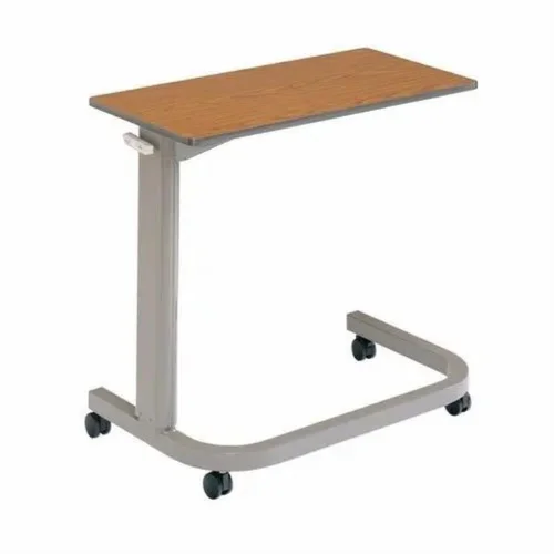 Brown overbed table constructed from wood and iron with epoxy powder coating. Adjustable size from 17 to 27 inches, featuring 4 wheels for easy maneuverability.