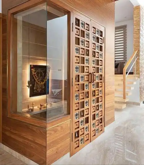 Brown Hinged Double Door Pooja Cabinet