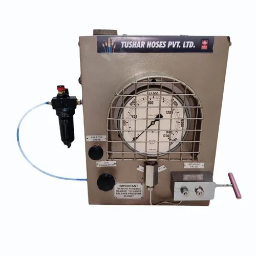 Automatic SS hydraulic hose testing machine with analog display. Operates on 220V, 50 Hz, and achieves 5000 PSI pressure. Ideal for hose performance verification in industrial applications.